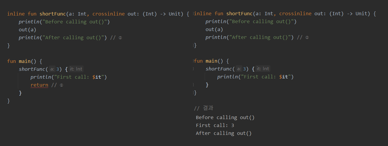 람다식 함수를 인자로 사용하는 함수는 의도하지 않게 람다식 함수 바깥에 있는 함수가 같이 반환되어 버리는데 이를 비지역 반환(non-local return)이라고 합니다. 이를 방지하기 위해서 crossinline을 사용할 수 있습니다.