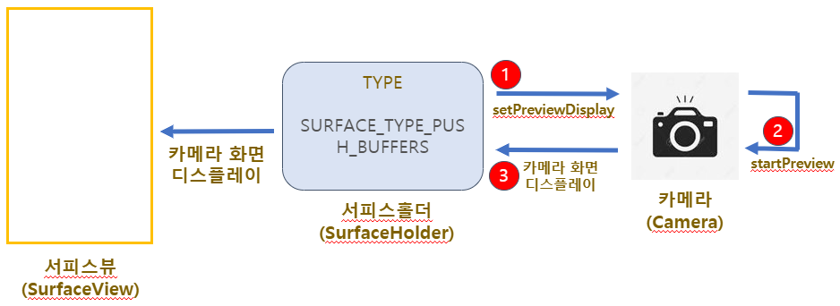 카메라 미리보기를 위한 서피스뷰의 사용 SufaceView는 일반 뷰처럼 화면의 일정 영역을 할당받는다. 하지만 View와 독립적으로 구성되어 있어서 직접 SurfaceHolder를 통해서 상태를 관찰하고 상태에 맞게 처리해줘야 한다.